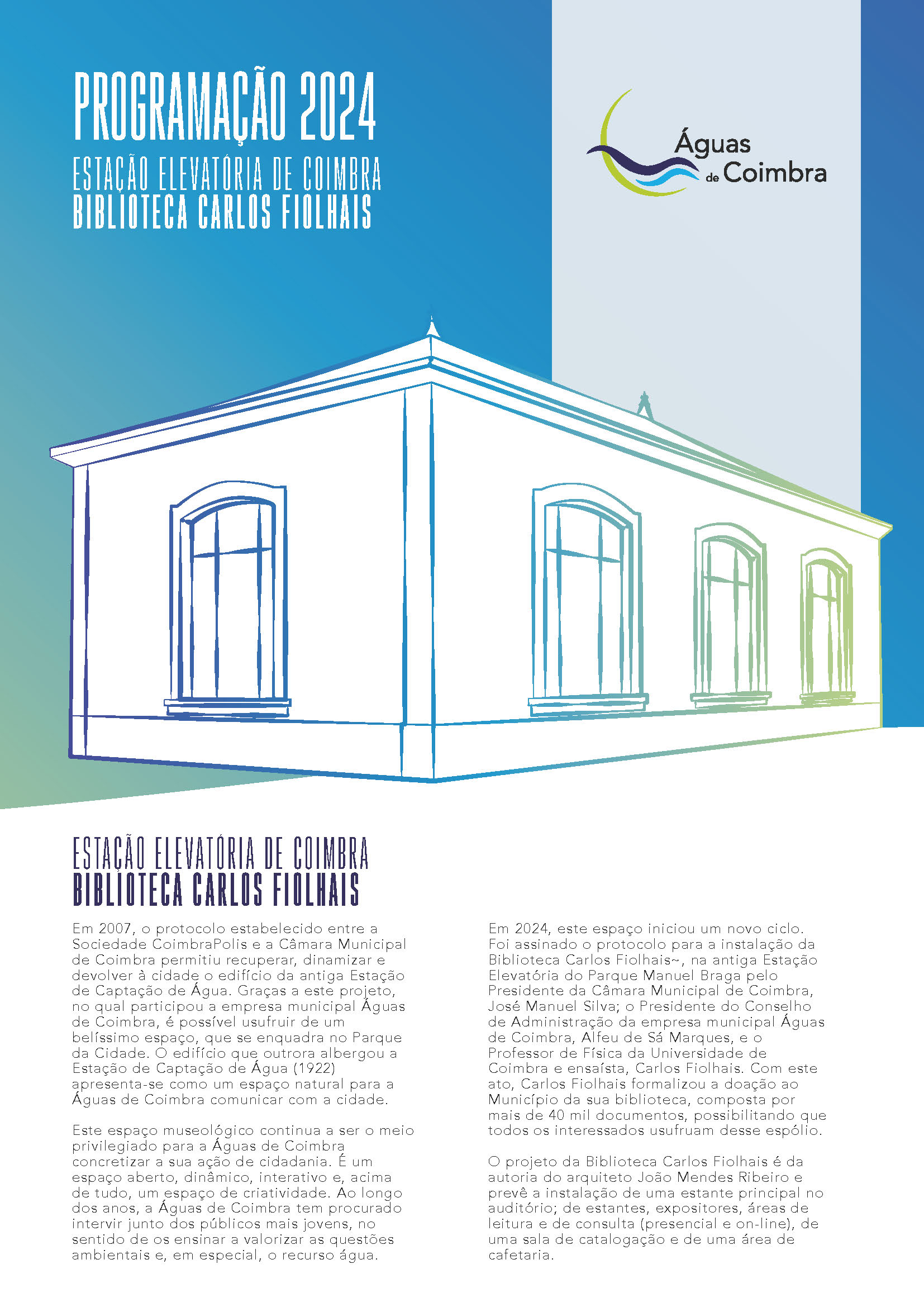 A criação da Estação Elevatória de Coimbra – Biblioteca Carlos Fiolhais marcou um novo ciclo para este espaço, em 2024. Para concretizar este projeto, foi assinado um protocolo entre a Câmara Municipal de Coimbra, a empresa municipal Águas de Coimbra e Carlos Fiolhais, investigador, físico e um dos mais destacados divulgadores científicos, em Portugal. Com este acordo, Carlos Fiolhais formalizou a doação ao Município de Coimbra da sua biblioteca, composta por mais de 40 mil documentos, permitindo o acesso público a esse espólio.