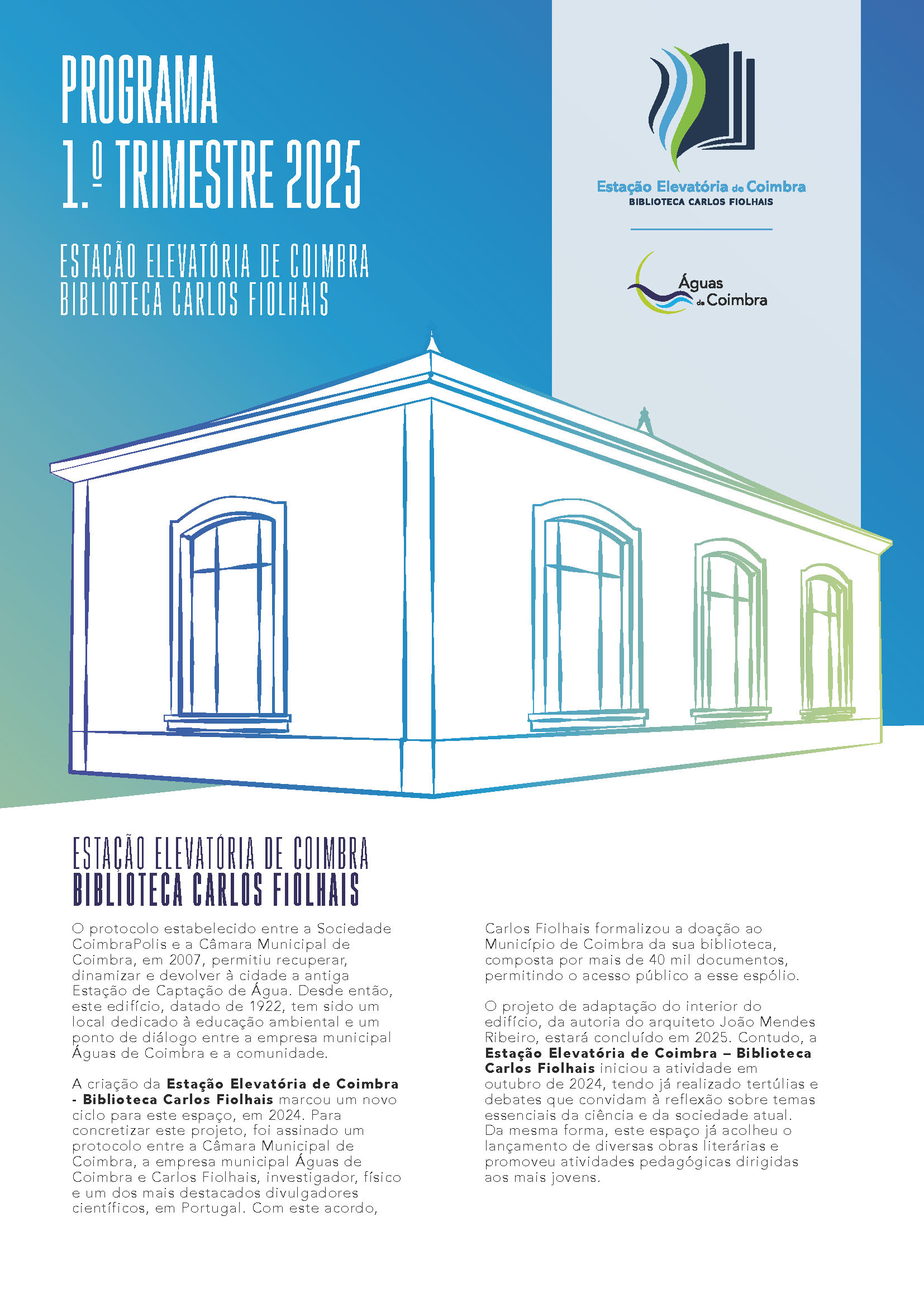 O projeto de adaptação do interior do edifício, da autoria do arquiteto João Mendes Ribeiro, estará concluído este ano. Contudo, a Estação Elevatória de Coimbra – Biblioteca Carlos Fiolhais iniciou a atividade em outubro de 2024, tendo já realizado tertúlias e debates que convidam à reflexão sobre temas essenciais da ciência e da sociedade atual. Da mesma forma, este espaço acolheu o lançamento de diversas obras literárias e promoveu atividades pedagógicas dirigidas aos mais jovens.